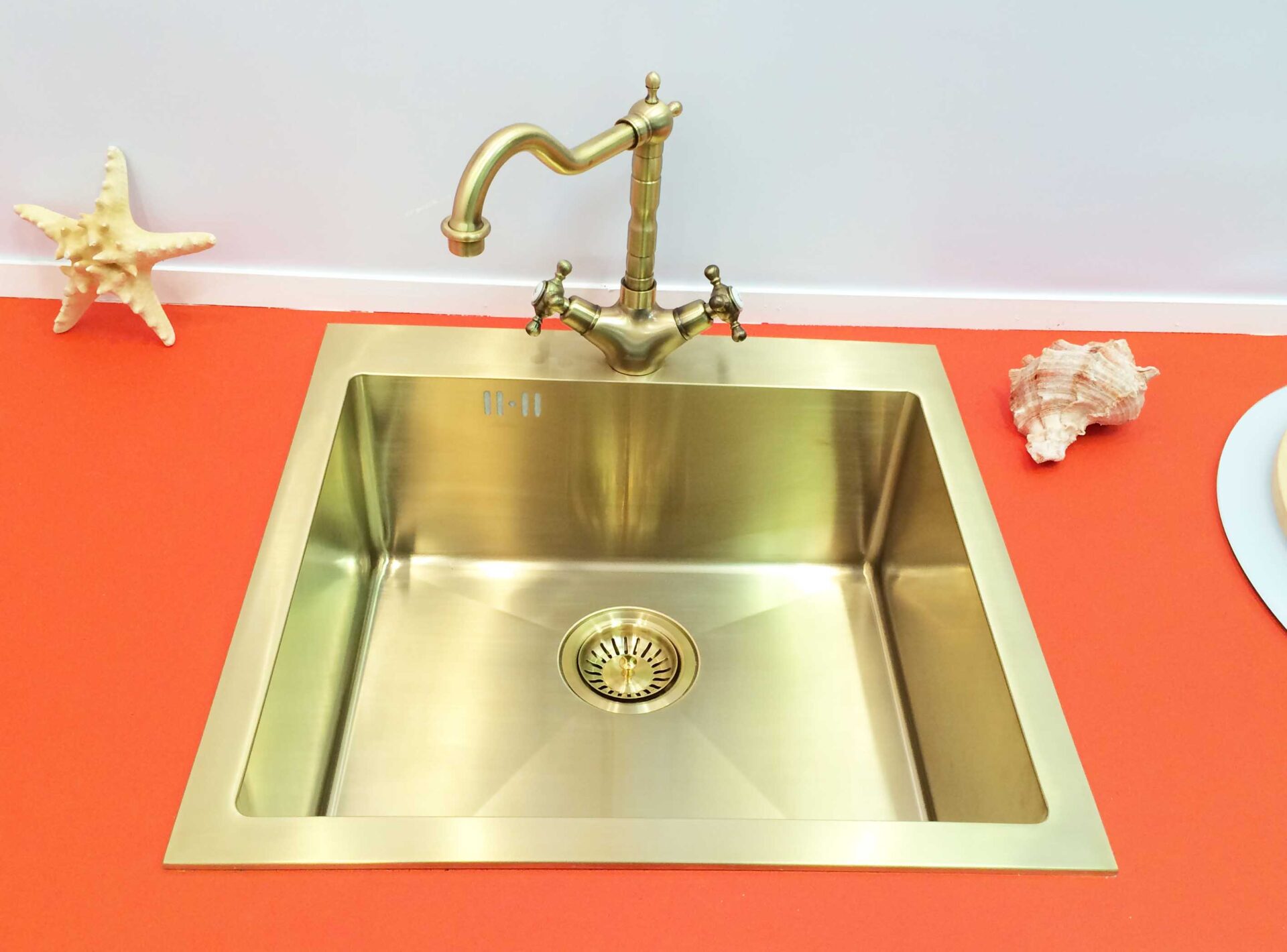 Кухонная мойка Seaman Eco Marino SMB-5151S -LG Light Gold (PVD) — стильная врезная квадратная одночашевая мойка для кухни из высококачественной нержавеющей стали марки AISI-304 (толщина стали 1,2 мм) с PVD-покрытием поверхности мойки цвета Светлое Золото (Gold 2). Выпуск в цвет мойки и сливная арматура — в комплекте. Форма: квадратная. База: от 60 см. Размеры мойки: 510*510 мм. Размеры чаши: 450*410*200 мм. Размеры выреза: 490*490 мм.